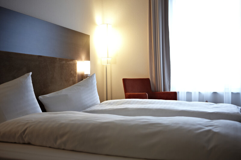 DZ Standard: 21 qm, modern und komfortabel ausgestattet, individuell regulierbare Klimaanlage, Bad/WC mit Dusche, Föhn und Kosmetikspiegel, Kingsize-Doppelbett (180 x 200 cm) oder zwei einzeln stehende Betten, Schreibtisch, kleine Sitzecke, Laptop-Safe, Minibar, Flatscreen-Kabel-TV, Highspeed-WLAN, 1 kleines Kind im Elternbett möglich, als EZ möglich