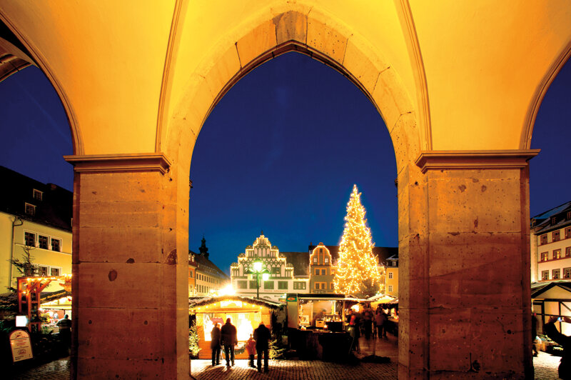 Die wunderschöne historische Stadt verzaubert zur Adventszeit große und kleine Besucher aus nah und fern. Vor allem die jüngeren Gäste erfreuen sich an dem riesigen Adventskalender, der am Weimarer Rathaus angebracht ist. Ein Highlight mit Spaßfaktor für jedes Alter ist die Eislaufbahn auf dem Theaterplatz, von der man hervorragend das malerische Stadtbild bewundern kann. Zum Aufwärmen zwischendurch sorgen verschiedene Glühweine oder typische Leckereien wie gebrannte Mandeln oder original Thüringer Würste.