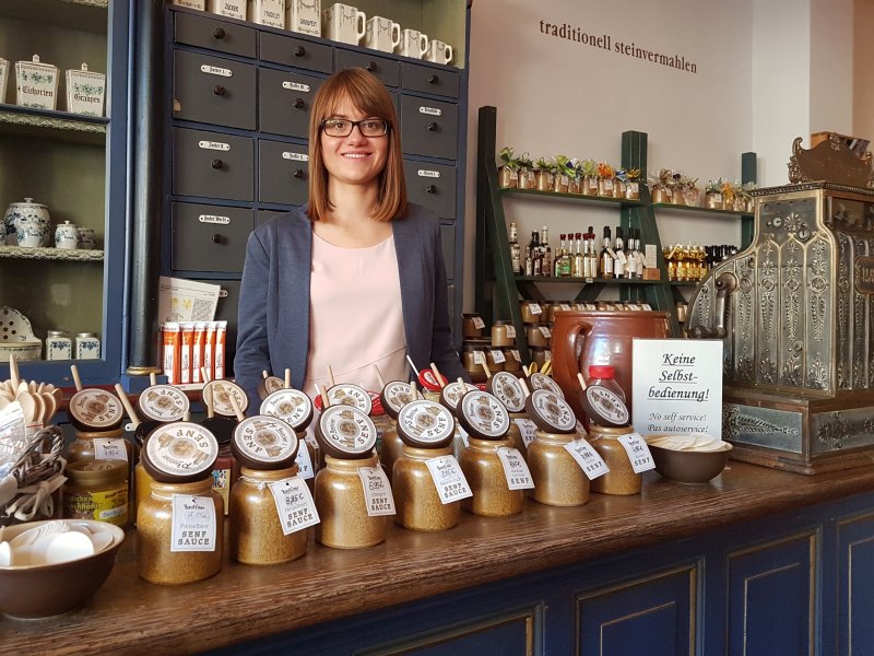 Melanie Schmitt arbeitet seit 2012 bei Spar mit! Reisen und produziert Reisepakete in Sachsen. Hier beim munteren Verkosten an der Theke des Bautzner Senfladens.