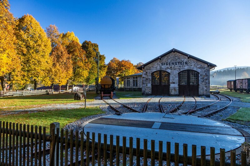 Außerdem gibt's das Bayerwald-Museum „NaturparkWelten“, das „Localbahnmuseum“ (Foto unten) mit 20 historischen Lokomotiven, die Galerie „Kunsträume“, die Schmugglerhütte und das Restaurant Grenzbahnhof „Vo'Gunders“ (11.00 - 21.00, Mo./Di. Ruhetag).