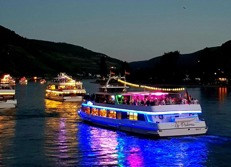 Rhein in Flammen feiert in diesem Jahr 70. Jubiläum - und Sie sind nicht nur dabei, sondern mittendrin! Wir nehmen Sie am ersten Maiwochenende in Bonn mit aufs Schiff zu einer spektakulären, mehrstündigen Feuerwerksfahrt. An Bord der „MS La Paloma“ erleben Sie die Beethovenstadt und den Rhein im Glanz von Licht, Feuer, Romantik und Emotionen hautnah aus allererster Reihe, mitten im Fluss. Los geht die Fahrt um 18.30 Uhr vom Bonner Brassertufer. Schon vor der Abfahrt lassen wir die Korken knallen, Startschuss für eine fröhliche Party an Bord. Bei gutem Wetter können Sie die Schifffahrt auf dem Freideck genießen.
