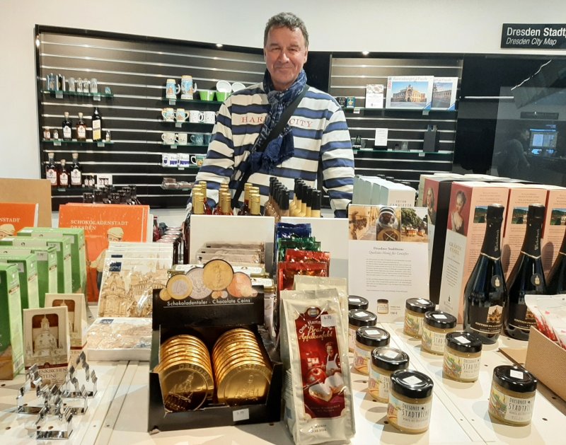 2013 eröffneten sie hier ihre neue Touristeninformation im Untergeschoss des „QF" am Neumarkt. „QF" heißt Quartier Frauenkirche und ist im Wesentlichen eine sehr feine Shopping Mall mit hochwertigen Läden, hippen Restaurants und direktem Zugang zur Parkgarage. Wenn Sie die Rolltreppe nach unten fahren, landen Sie bei der TI Dresden. Die sieht aus wie eine moderne Mischung aus Flughafen-Schalter, Buchladen und Souvenir-Shop. Alles fein, riesige Auswahl, in einem kleinen Kino laufen Imagefilme über die Stadt.