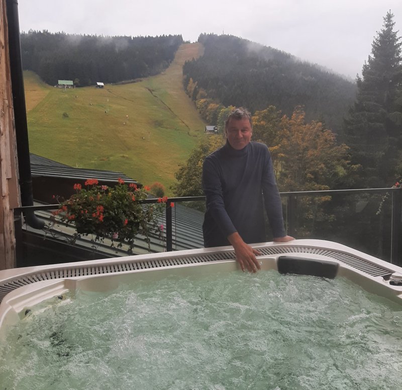 Whirlpool mit Aussicht - das ist der echte Wellness-Traum. Wie hier in Harrachov im Naturpark Riesengebirge. Sie sitzen im wohlig warmen Wasser und schauen auf den 1.020 m hohen Certova Hora (= Teufelsberg), Hausberg des beliebten, tschechischen Urlaubsorts. Einfach herrlich, oder?
