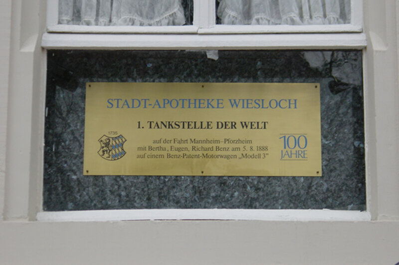 Denn es war Bertha Benz, die Frau des berühmten Automobil-Erfinders Carl Benz, die im Jahre 1888 mit einem der ersten patentierten Motorwagen ihres Mannes auf Reisen war, als ihr kurz vor Wiesloch der Treibstoff ausging. Kurzerhand ging sie in die Wieslocher Stadtapotheke und ließ sich dort das Lösungsmittel Ligroin geben, das ersatzweise als Treibstoff diente und ihr Fahrzeug wieder zum Laufen brachte. Somit wurde die Stadtapotheke zur ersten Tankstelle der Welt. Heute erinnern ein Schild am Fenster und eine Plastik von Bertha Benz mit ihrem Vehikel (Fotos unten) vor der Apotheke an diesen epochemachenden Moment.