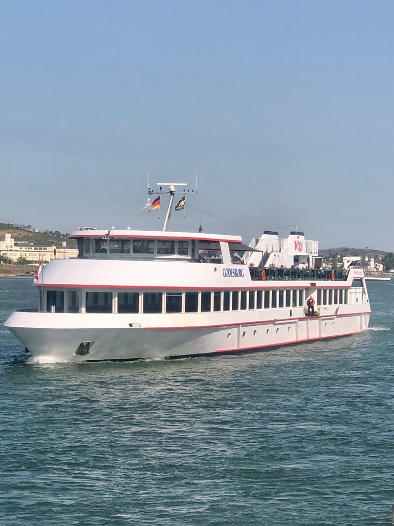 Seit 1994 fährt die MS Godesburg den Rhein rauf und runter, von Koblenz nach Mainz und zurück im Liniendienst. Benannt ist das 66 Meter lange Dreideckschiff nach der Godesburg im Bonner Stadtteil Bad Godesberg. Wen es interessiert: Getauft hat das Schiff am 8. Juni 1994 Karin Clement, die Frau des damaligen SPD-Ministers.