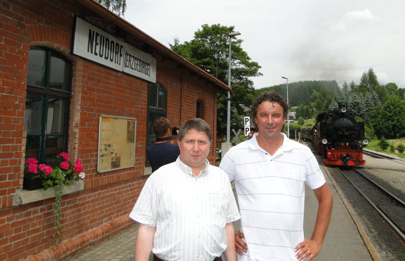Als Sponsor des FC Erzgebirge Aue war Spar mit!-Chef Mathias Finck oft im schönen Erzgebirge, hier mit Freund Michael Schindler (links) aus Eibenstock. Die Fahrt mit der Fichtelbergbahn (hinten kommt sie gerade) durfte natürlich nicht fehlen.