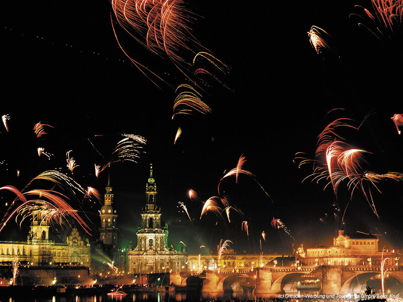 Denn das lohnt sich speziell an diesen Tagen. In der Neujahrsnacht brechen in Dresden alle Dämme, das ist nicht anders als in Berlin, Hamburg oder München. Und das macht ja auch Freude. Wenn sich die Lichter des fulminanten Feuerwerks in der Elbe spiegeln - das hat was. Nachteil des Silvesterrummels: Die Stadt ist pickepackevoll, die Silvester-Veranstaltungen sind ausgebucht. Was nicht weiter schlimm ist, denn das richtige Jahresendgefühl erleben Sie sowieso draußen auf dem Theaterplatz und den Brühlschen Terrassen.