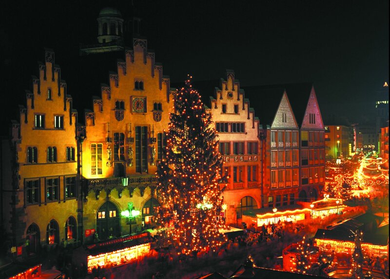 Mittlerweile hat sich Frankfurts Weihnachtsmarkt breit aufgestellt. Herz des Adventsvergnügens ist zwar immer noch der Römerberg, aber auch anderswo stöbert man durch Budendörfer. Auf dem Friedrich-Stoltze-Platz ist alles pink und rosa, in Preungesheim und Dornbusch feiert man auf skandinavische Art. Vom Roßmarkt über die Zeil bis zum Römerberg und Main zieht sich der Hauptweihnachtsmarkt, früher Christkindchesmarkt genannt. Dort stehen über 200 Stände, eine bunte Mischung aus Gastronomie, Karussells und vor allem Kunsthandwerk- und Spielwaren Ständen. Bis in die 70er-Jahren war es in Frankfurt üblich, dass Eltern ihren Kindern zu Weihnachten ausschließlich Spielzeug vom Frankfurter Weihnachtsmarkt schenkten. Auch heute findet man hier eine große Auswahl: erzgebirgisches Kunsthandwerk, Strickwaren, selbst gezogene Kerzen, Nussknacker, Blech- und Holzspielzeug und Christbaumschmuck. Wer sich kulinarisch weiterbilden will, sollte einen Becher heißen Apfelwein trinken (jedes Jahr gibt es die Punschbecher mit verschiedenen Frankfurter Motiven, ein Sammlerobjekt), dazu ein Bethmännchen essen, leckeres Marzipangebäck. Auch typisch: Brenten (Teegebäck) und Quetschemännchen, Figuren, die aus getrockneten Pflaumen und Nüssen bestehen. Doch nicht nur Shoppen und Schmausen sind Programmpunkt – Adventskonzerte, Gebärdenchor, Besuch des Weihnachtsmannes, Turmblasen vom Altan der Nikolaikirche, Frankfurter Stadtgeläut, historische Eisenbahn und mehr begleiten den Weihnachtsmarkt. Unübersehbares Wahrzeichen und Lieblingsfotomotiv der Besucher: der riesige Weihnachtsbaum.