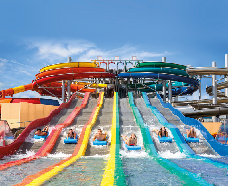 Wer als Familie unterwegs ist, ist im Erlebnisbad bestens aufgehoben. 28 Rutschen mit drei Schwierigkeitslevel und einer Gesamtlänge von 2.850 Metern begeistern die Besucher in der Galaxy Rutschenwelt. Mit und ohne Reifen, steil hinunter, nebeneinander um die Wette, überdacht oder unter freiem Himmel – Spaß macht es in allen Fällen! Ein ganz besonderes Erlebnis ist die VR-Rutsche. Einfach Virtual-Reality-Brille aufsetzen, Reifen schnappen und während der Rutschpartie durch die Galaxis fliegen oder einen wilden Dschungel durchstreifen. Erleben Sie außerdem eine rasante Fahrt durch den Wilden Westen mit Ihrem Lieblingscharakter von Bully Herbig. Ebenfalls sehr beliebt ist das Wellenbad. Abenteuerlustige Badegäste werden von sanften Wogen bis zu zwei Meter hohen Brechern durch das Wasser getragen. Wer dann noch nicht genug hat, kann sich vom Strömungskanal ins Außenbecken treiben lassen. Während der Nachwuchs herumtollt, genießen Sie die zehn Pools und Gesundheitsbäder des Erlebnisbades – in Thermenbecken, Sole-Grotte, Schwefeltopf und Jungbrunnen klappt es mit der Erholung auf jeden Fall. Oder Sie legen sich auf eine der Liegen und träumen unterm Palmenhimmel von der Südsee. Wenn die Kinder dann hungrig vom Planschen zurückkommen, muss eine harte Entscheidung gefällt werden: Burger, Crêpes oder doch Frozen Yoghurt? Auswahl gibt es jedenfalls genug und an den drei Poolbars ist außerdem für Softdrinks und Cocktails gesorgt.