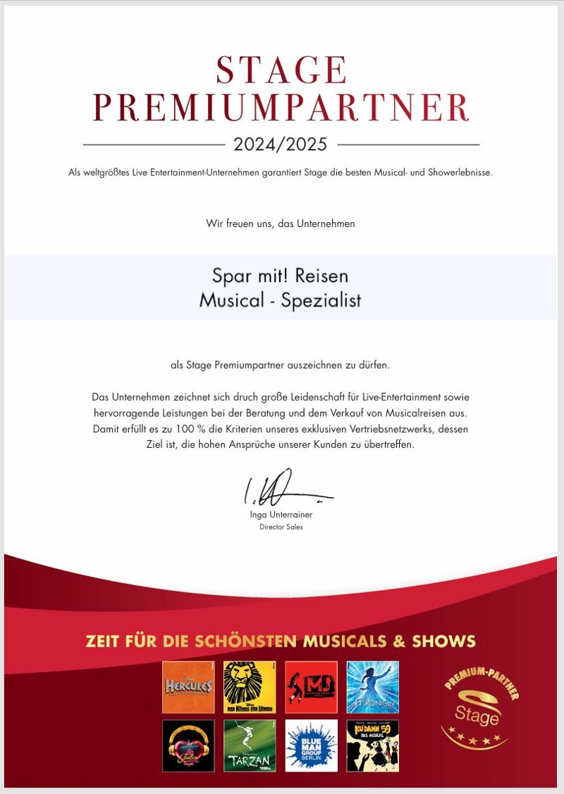 Das Stage-Gütesiegel ist ein Symbol und Garant für die besten Musical-Erlebnisse in Deutschland! Stage Entertainment steht für Produktionen auf höchstem Niveau mit einzigartigen Inszenierungen, fantastischen Bühnenbildern, hochklassigen Künstlern und mitreißender Musik. Menschen aus ihrem Alltag zu entführen, sie zu berühren und ihnen unvergessliche Momente zu bescheren - das ist die Leidenschaft aller Mitarbeiterinnen und Mitarbeiter von Stage Entertaiment. Das größte Musical-Unternehmen der Welt bringt seit über zehn Jahren erfolgreiche Broadway-Hits wie Disneys "Der König der Löwen", Disneys Musical "Aladdin" oder das einzigartige Show-Erlebnis "Blue Man Group" auf die Bühne. Auch die Stage-Eigenproduktionen wie „Tina – Das Tina Turner Musical“ und „Pretty Woman“ begeisterten das Publikum.